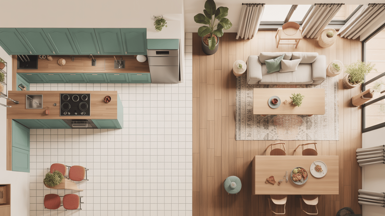 Délimiter cuisine et salon par le sol sans cloisonner l’espace